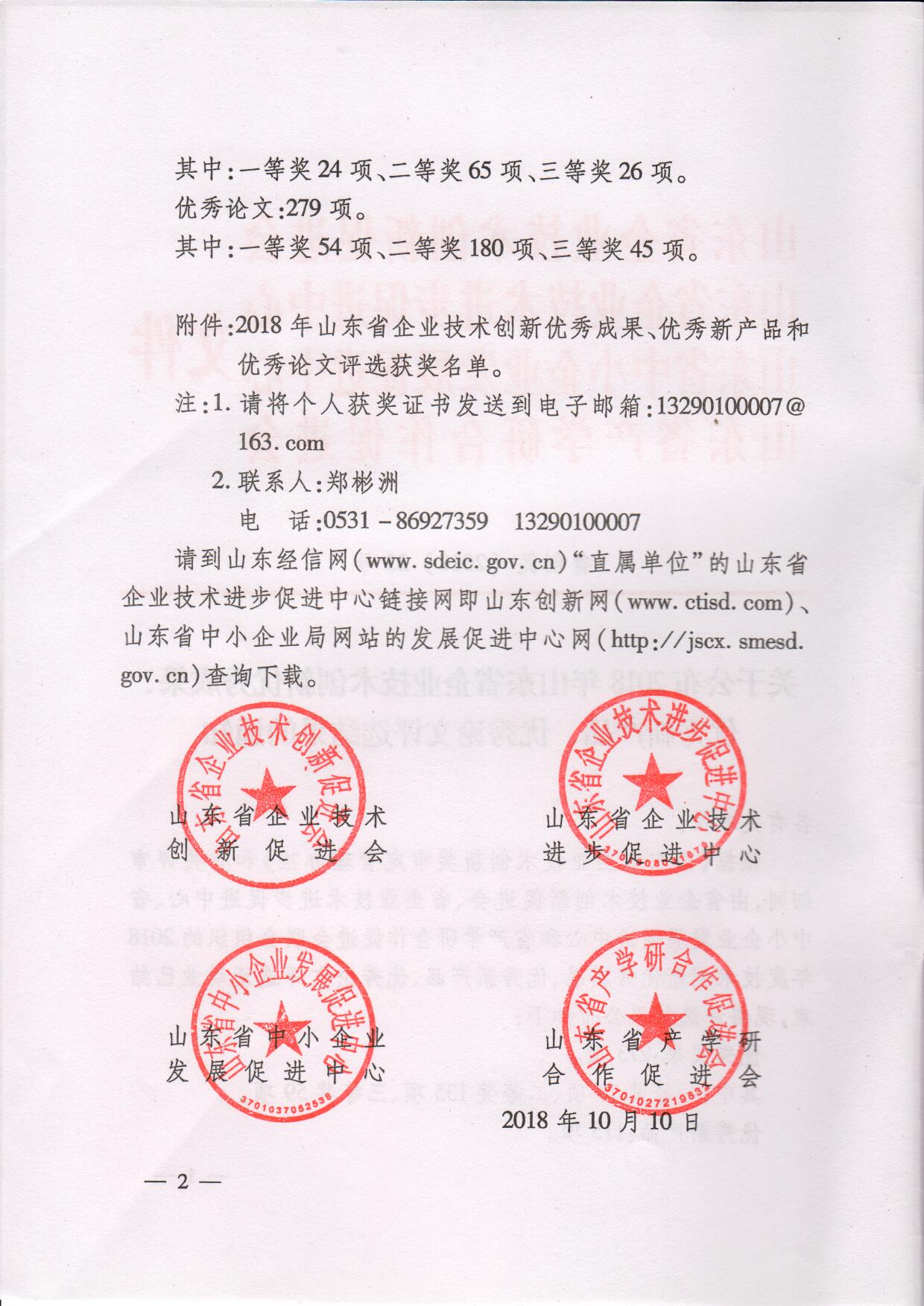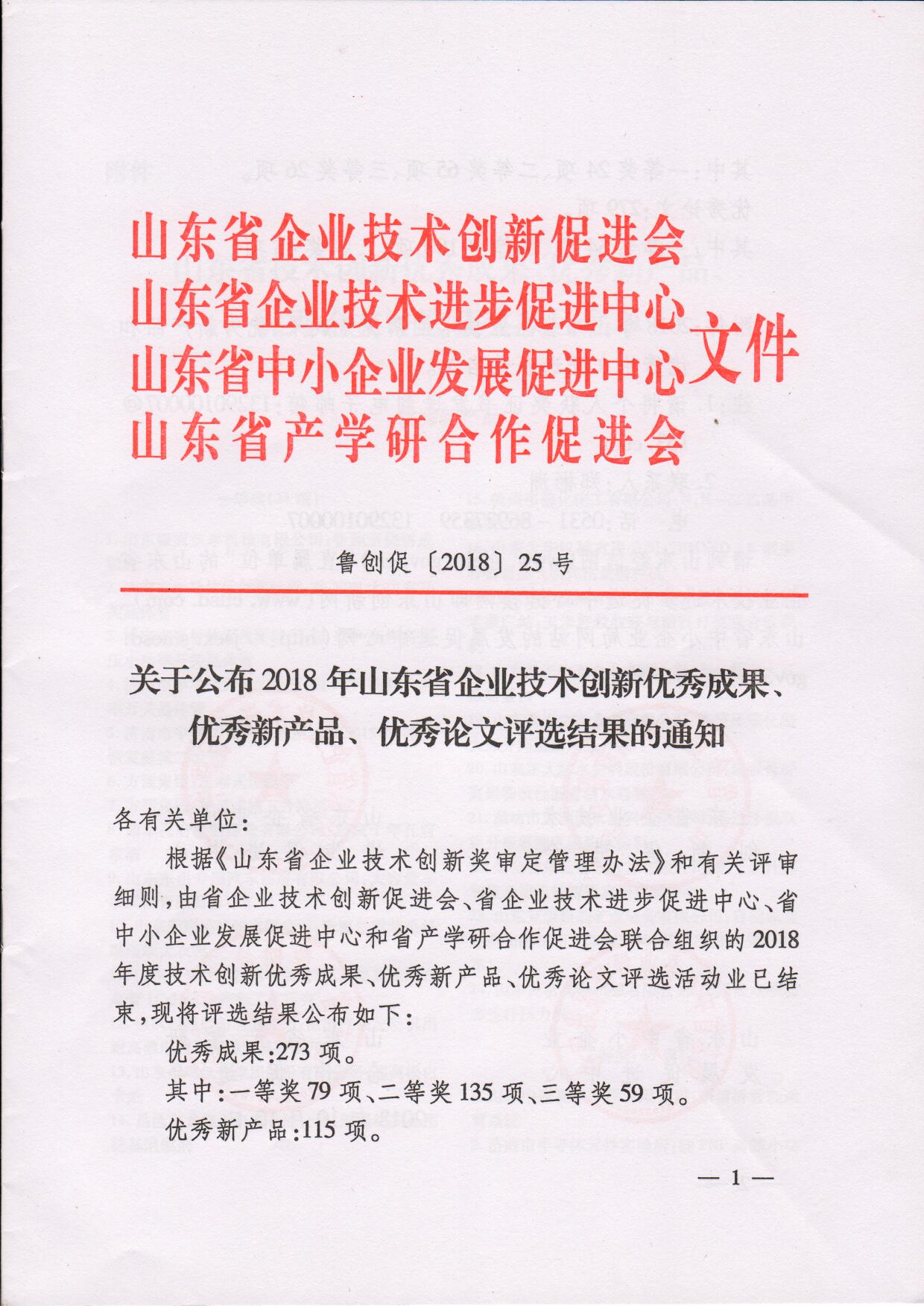 關(guān)于公布2018年山東省企業(yè)技術(shù)創(chuàng)新優(yōu)秀成果、優(yōu)秀新產(chǎn)品、優(yōu)秀論文評(píng)選結(jié)果的通知