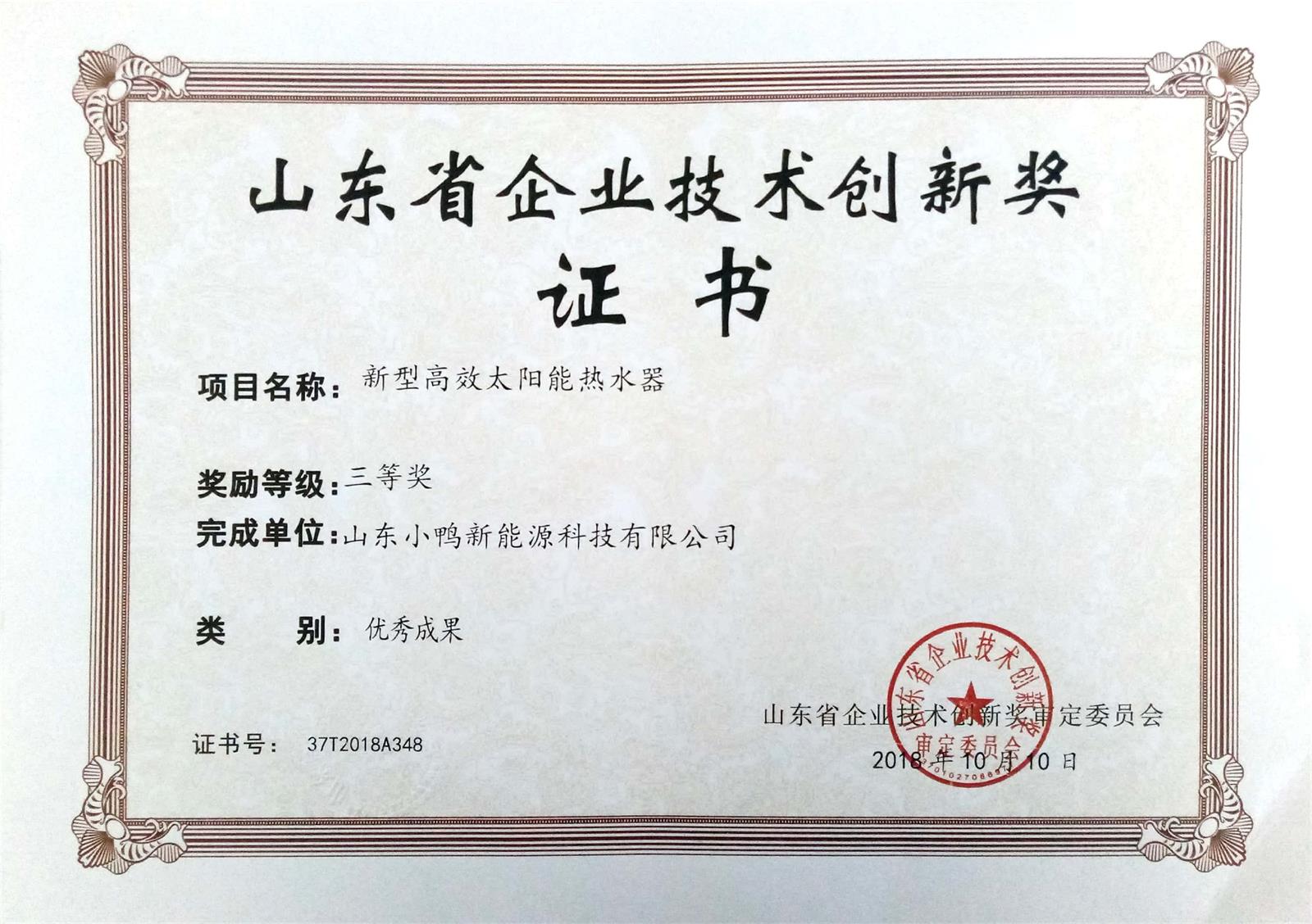 近日,由省企業(yè)技術(shù)創(chuàng)新促進(jìn)會(huì)、省企業(yè)技術(shù)進(jìn)步促進(jìn)中心、省中小企業(yè)發(fā)展促進(jìn)中心和省產(chǎn)學(xué)研合作促進(jìn)會(huì)聯(lián)合組織的2018年度技術(shù)創(chuàng)新優(yōu)秀成果、優(yōu)秀新產(chǎn)品、優(yōu)秀論文評(píng)選結(jié)果揭曉,我公司“新型高效太陽(yáng)能熱水器”榮獲山東省企業(yè)技術(shù)創(chuàng)新優(yōu)秀成果三等獎(jiǎng)。