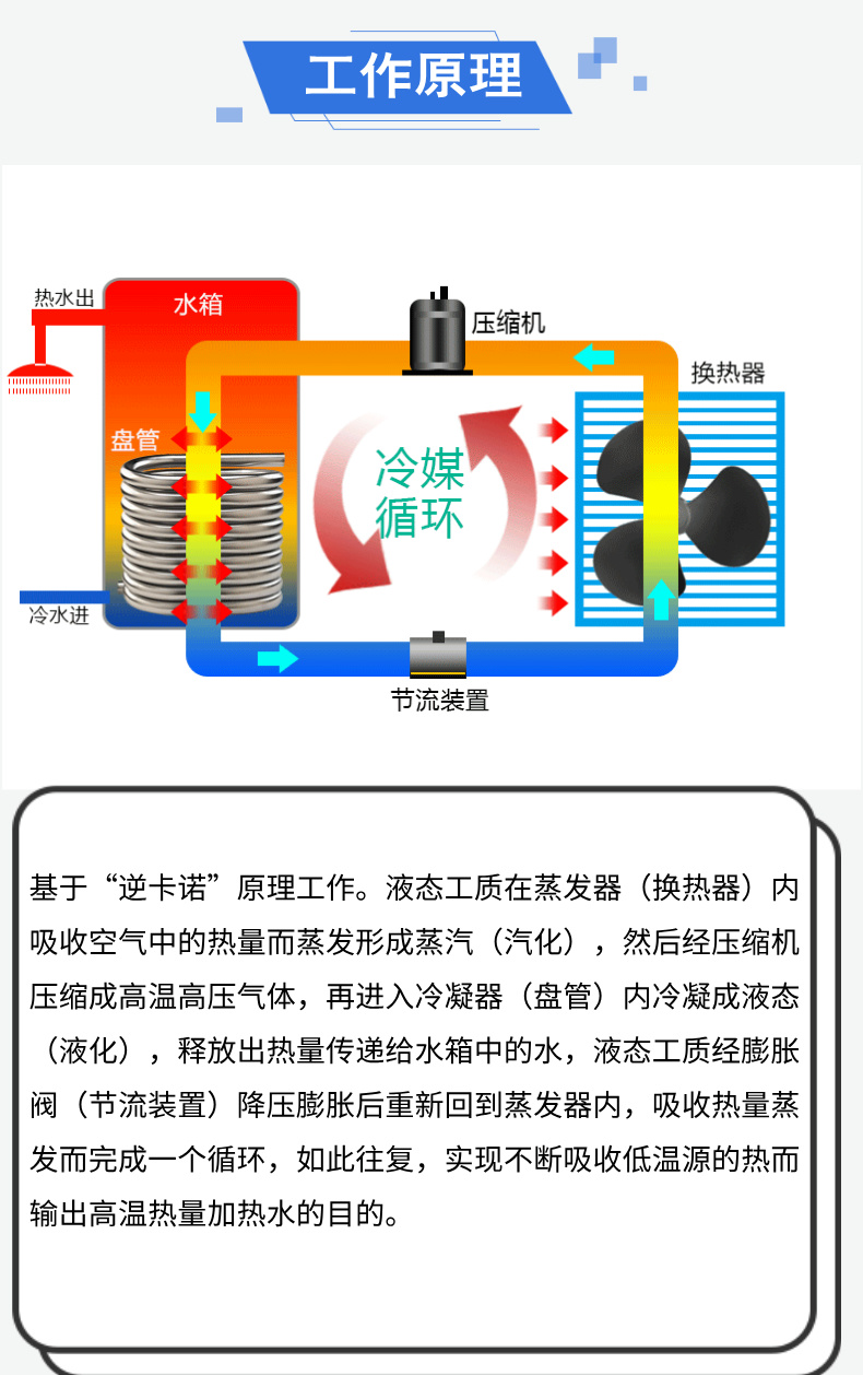 分體式空氣能熱水器主要依據(jù)逆卡諾原理工作,通過吸收空氣中的熱量并轉(zhuǎn)化為熱能來加熱水。室外機(jī)(風(fēng)機(jī)盤管)作為蒸發(fā)器,吸收外界空氣中的熱量,經(jīng)過壓縮機(jī)壓縮后,將高溫高壓的制冷劑輸送到室內(nèi)機(jī)(水箱內(nèi)的冷凝盤管),與水進(jìn)行熱交換,從而加熱水箱中的水。